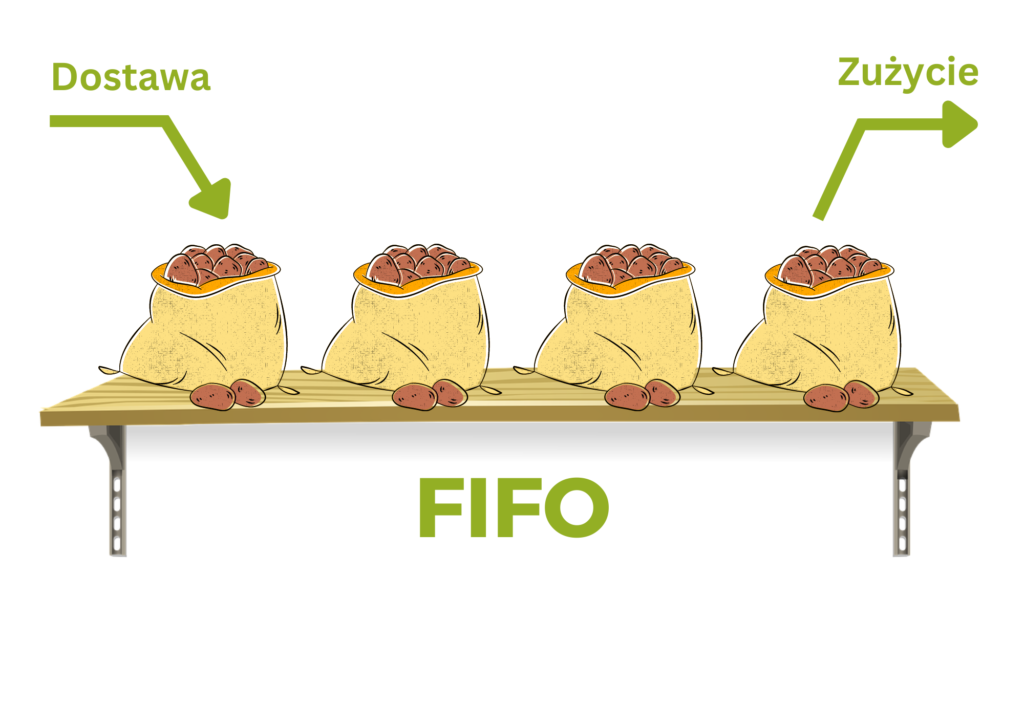 Rotacja oznacza wymianę. Wyobraź sobie kartony z mlekiem. Mają całkiem długi termin przydatności, dlatego zamawiamy ich nieco więcej, na przykład 15. Przyjeżdżają i ustawiamy je na półce. Kucharz zużywa 13. Składamy nowe zamówienie. Znów ustawiamy je na półce. Co więc zrobić z tymi dwoma kartonami, które zostały po poprzednim zamówieniu? Oczywiście wykorzystać. Jednak w pierwszej kolejności! Kartony z nowej dostawy postaw z tyłu, a te z poprzedniej dostawy z przodu. Taka metoda magazynowania nazywa się FIFO „First-In, First-Out”, czyli tłumacząc na język polski: „pierwsze weszło, pierwsze wyszło”. Jak widziałeś w przykładzie, pozwala ona pozbywać się dłużej składowanych produktów.