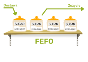Jednak metoda ta nie jest obarczona wadami. Wyobraź sobie, wspomnianą wcześniej sytuację, z tą różnicą, że mleka z pierwszej dostawy miały termin przydatności do 20 maja, a te, które dotarły do nas w drugiej turze, traciły ważność 10 maja. Co powinniśmy zrobić? Logika podpowiada, że powinniśmy wykorzystać najpierw produkty, z wcześniejszym terminem przydatności. I słusznie. Taka metoda magazynowania nazywana jest FEFO („First-Expired, First-Out”, z ang. „pierwszy stracił ważność, pierwszy wyszedł”). Ta metoda pozwala pozbyć się najpierw surowców, których termin przydatności do spożycia mija wcześniej.