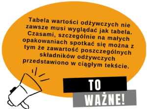 Z tabeli powyżej odczytać można zawartość podstawowych składników odżywczych w 100g produktu. Na tej podstawie w łatwy sposób można wyliczyć ile danego składnika odżywczego znajduje się w porcji. Sposób obliczania wartości odżywczej poznasz w dalszej części kursu.